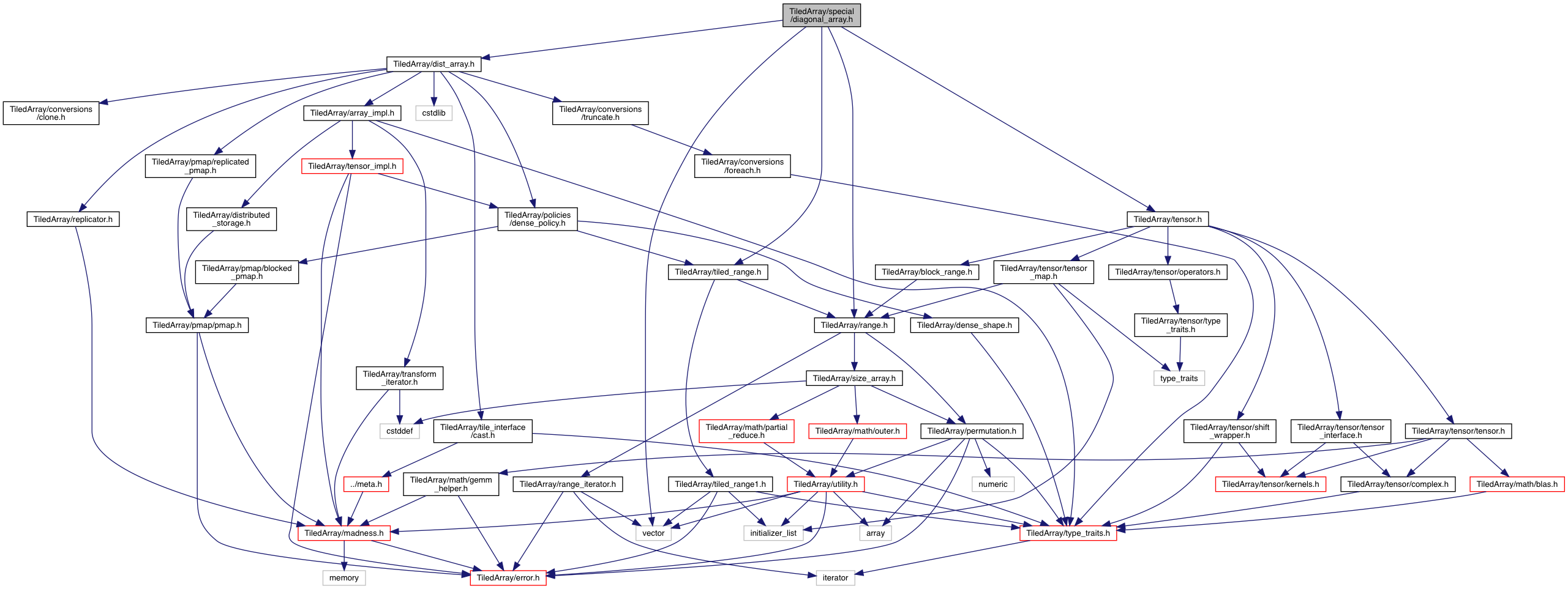 | DistArray< Tensor< T >, std::enable_if_t< std::is_same< Policy, DensePolicy >::value, Policy >> | TiledArray::diagonal_array (World &world, TiledRange const &trange, T val=1) |